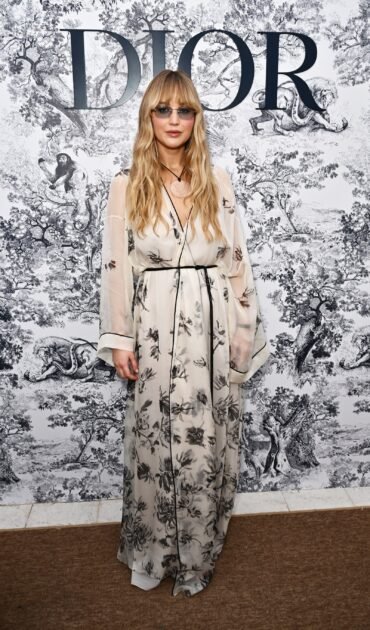 Earlier in the day, she also wore a different Dior ensemble that leaned more boho, in a white and black floral maxi dress with sheer sleeves and black piping—perfect for attending a Dior dinner and for a walk along the promenade, if she so wished.