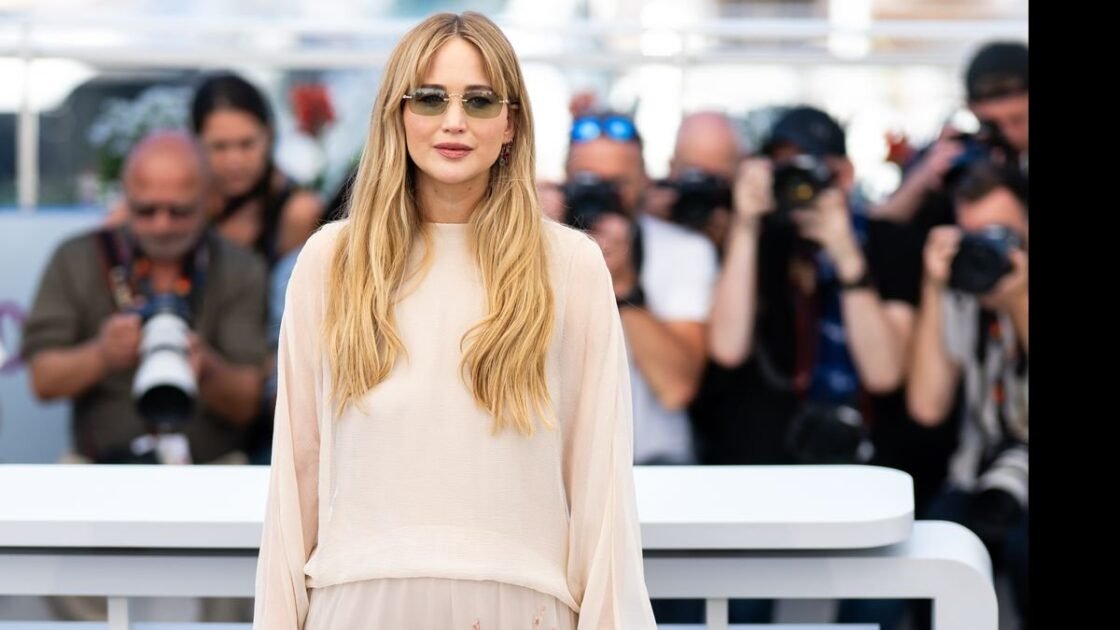 On Sunday, Jennifer Lawrence continued her series of press events for Die, My Love, her newest film, which premiered at the 2025 Cannes Film Festival on May 17. For the press conference, Lawrence wore a flowing embroidered dress in a nude tone fading into a leafy green tint at the hem, which was embroidered with a floral motif.